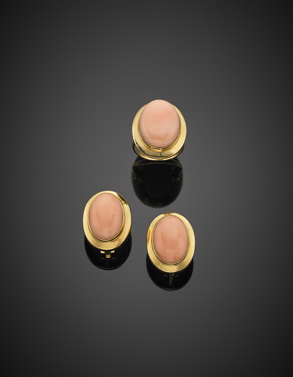 Pink coral and yellow gold jewellery set comprising ring and earrings, in all g 19.66.