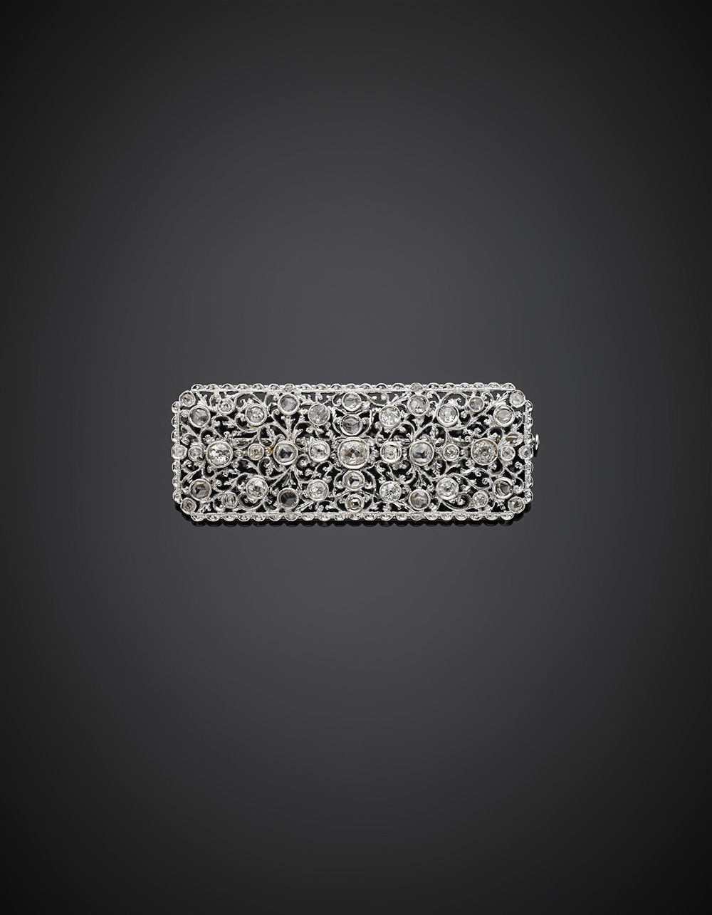 Spilla in oro bianco, lavorata come a pizzo e rifinita con diamanti rotondi, taglio a mezza rosetta, g 10,57, lungh. cm 5,40 circa.