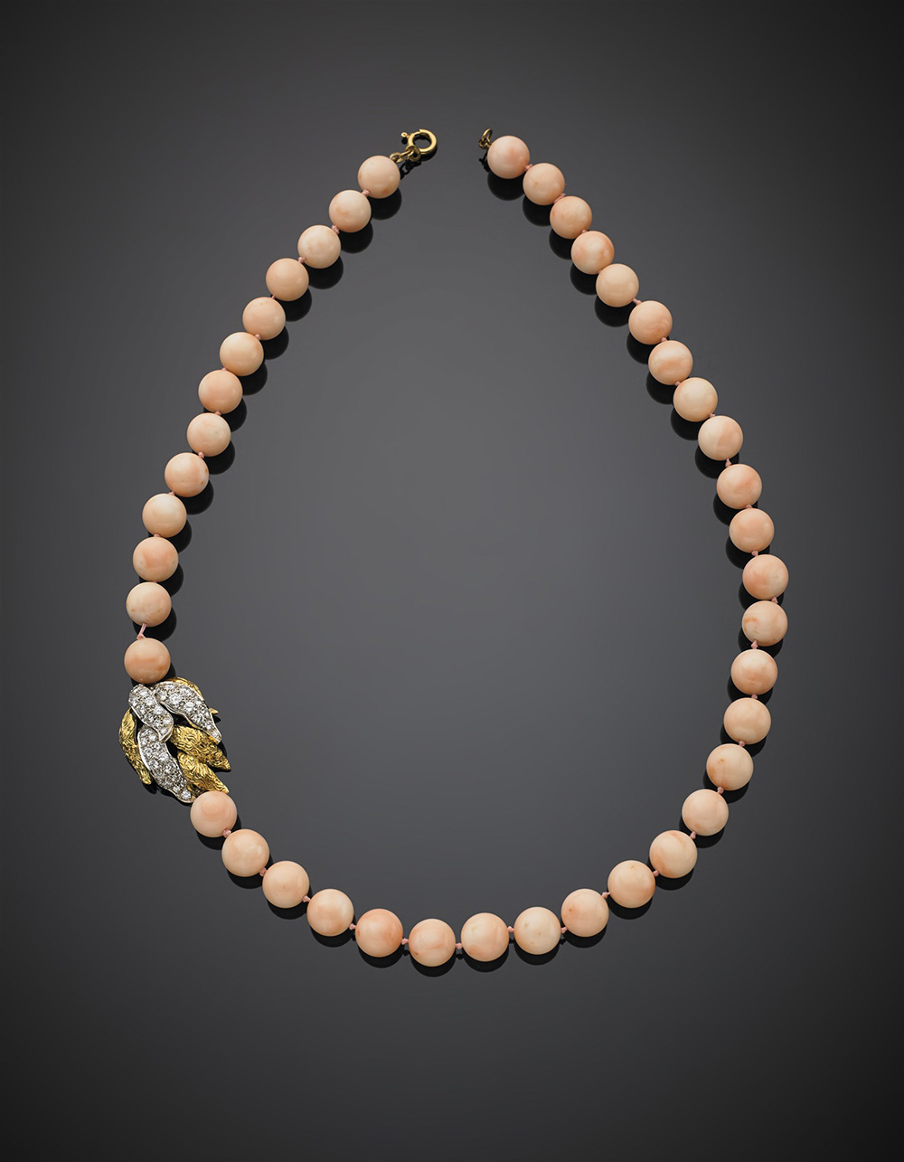 Pink coral bead necklace with bi-coloured gold diamond central motif and yellow gold clasp, bead diam. mm 11 circa, g 89.83, length cm 58 circa.