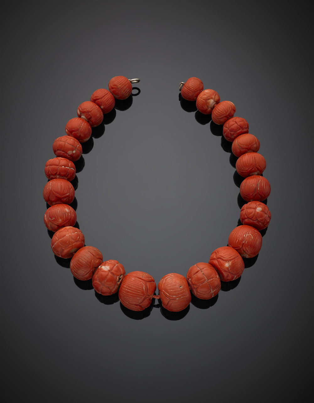 Collana a scalare in boules di corallo bambù rosso arancione scolpito, diam. delle boules da mm 17 a mm 25, g 292,53, lungh. cm 44 circa.