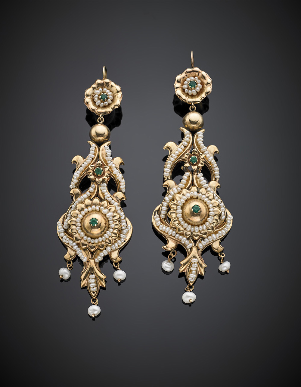 Orecchini pendenti in oro giallo 585/1000 a monachella in stile Borbonico con microperle e paste vitree verdi, g 16,04, lungh. cm 10,20 circa.