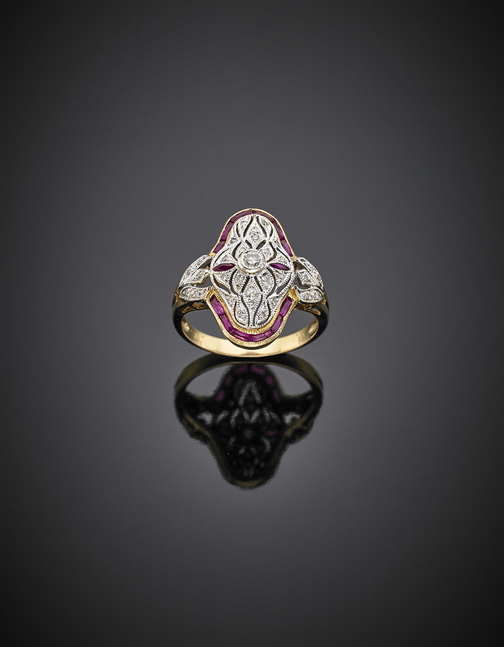 Anello in oro giallo e bianco, rifinito con diamanti e rubini calibré, g 6,40 misura 22/62.