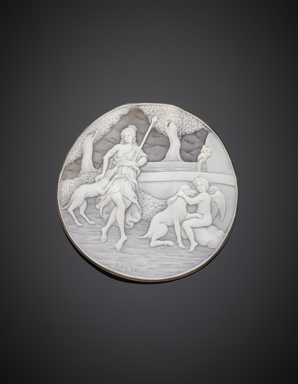 Cammeo rotondo in conchiglia, con raffigurata Diana cacciatrice con putto e cani, g 30,6, diam. cm 8. Firmato Balzano.