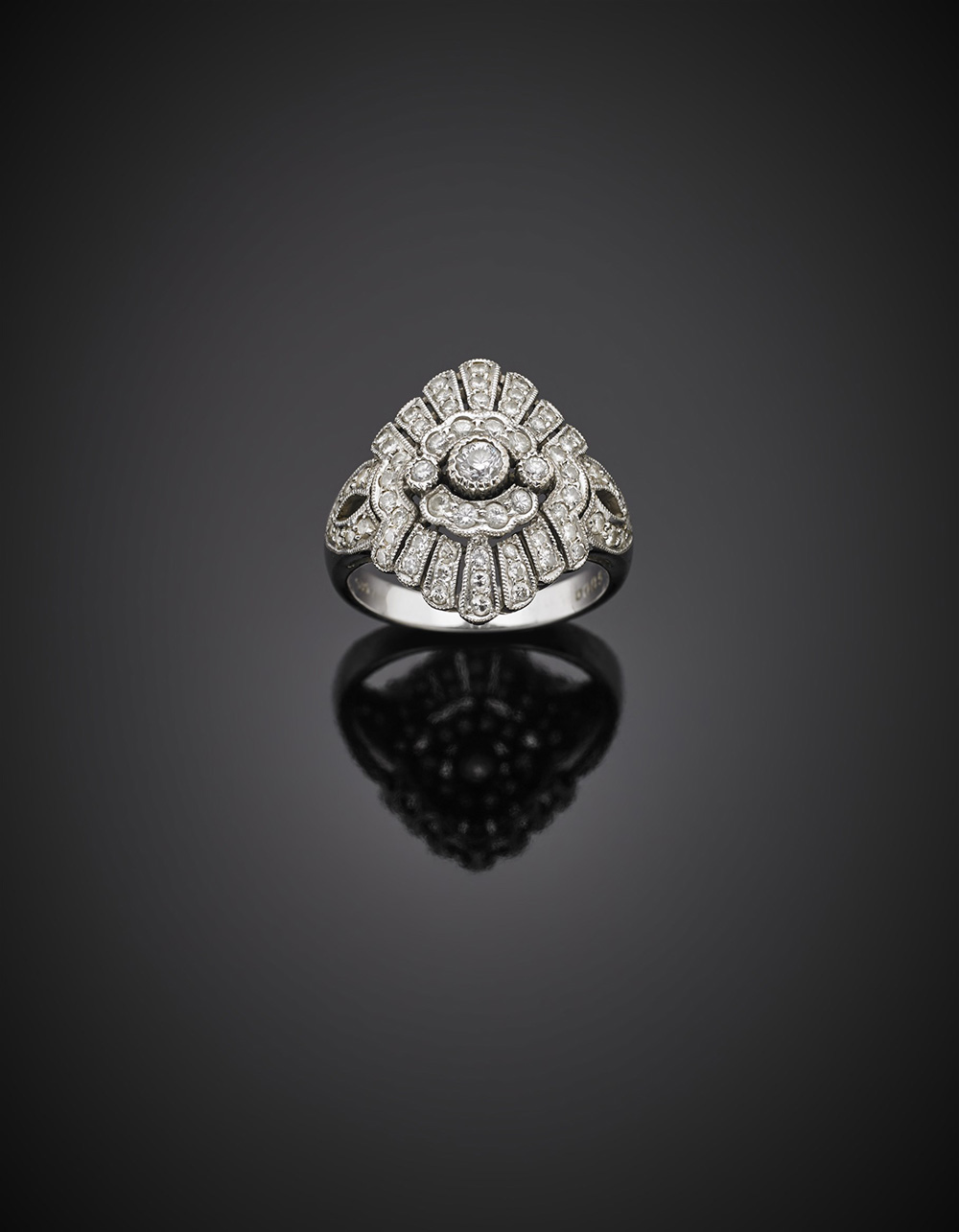 Anello art nouveau in oro bianco 585/1000 con diamanti, inv. D085, g 4,67 misura 13/53.