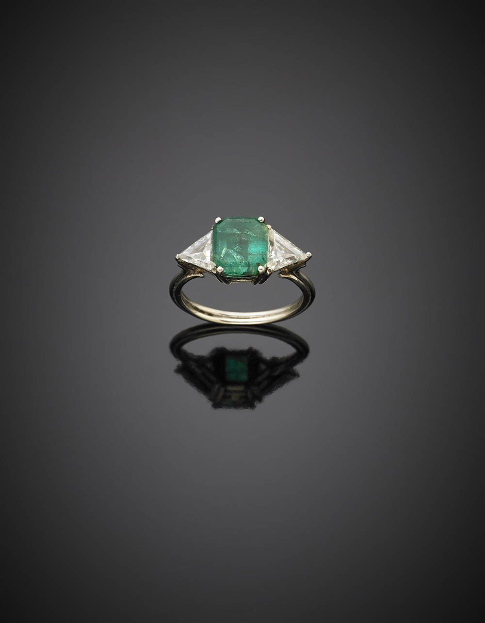 Anello in oro bianco con due diamanti triangolari per complessivi ct. 0,80 circa ai lati di uno smeraldo ottagonale di ct. 2,15 circa, g 3,79 misura 13/53.
