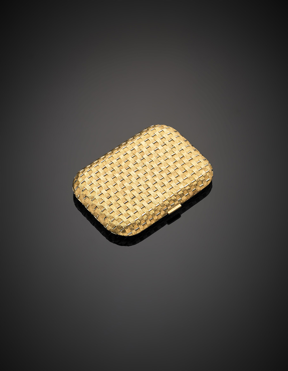 *Portacipria con lavorazione a cesto intrecciato in oro lucido e satinato, cm 8,8x6,2x1,2, lordi g 172,77.