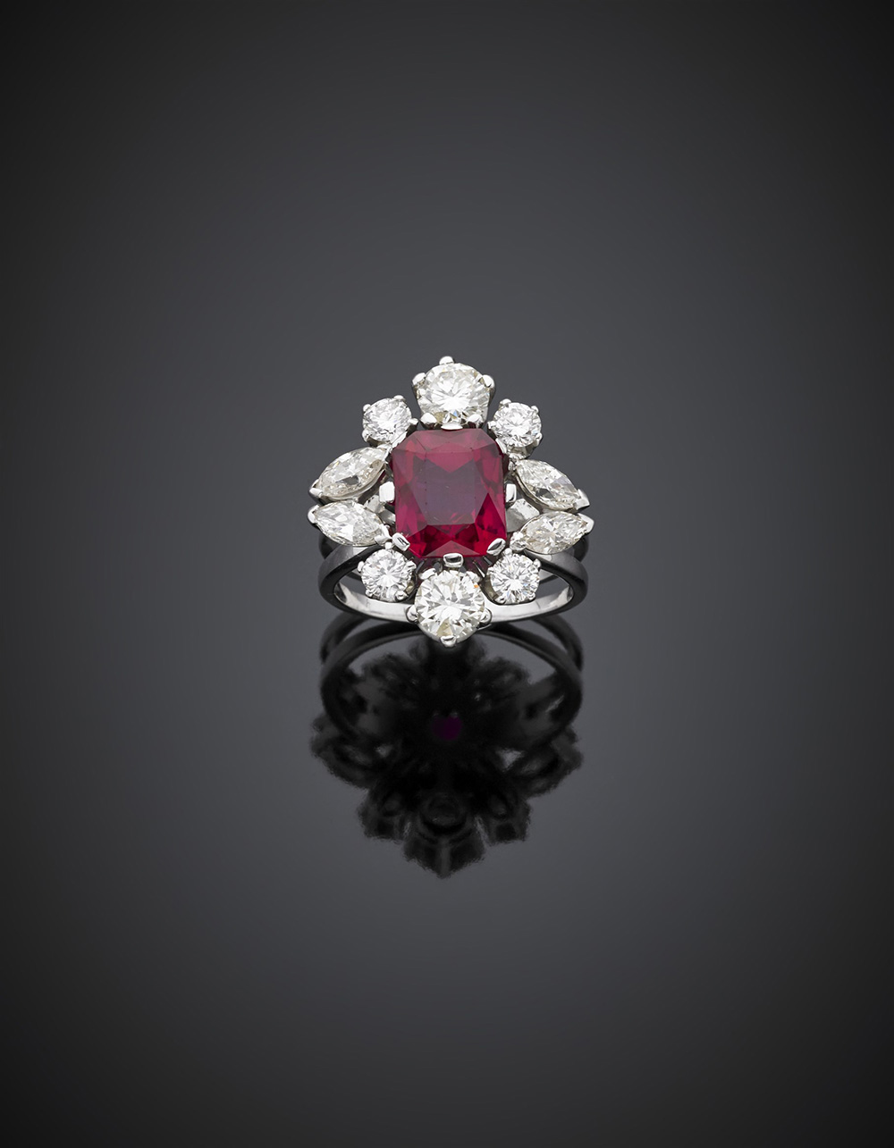 Anello in oro bianco con diamanti rotondi e a navette per complessivi ct. 2,83 circa con al centro rubino sintetico ottagonale, taglio a gradini, g 8,27 misura 13/53.