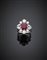 Round and marquise, in all ct. 2.83 circa diamond white gold ring centered by a step cut synthetic ruby, g 8.27 size 13/53.