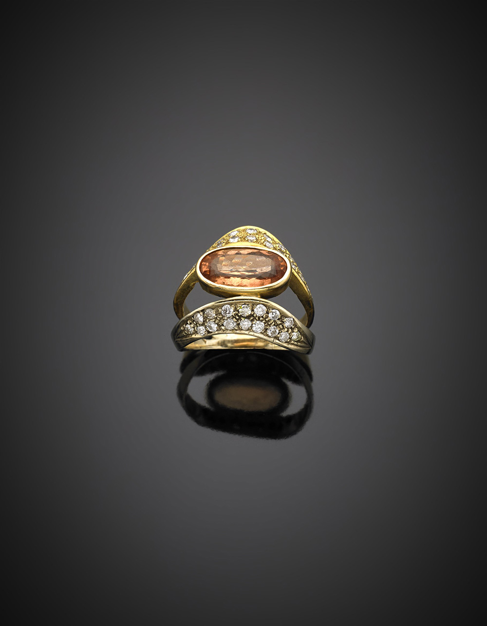 Yellow pinkish oval topaz and diamond bi-colored gold ring, g 9.29 size 20/60.