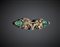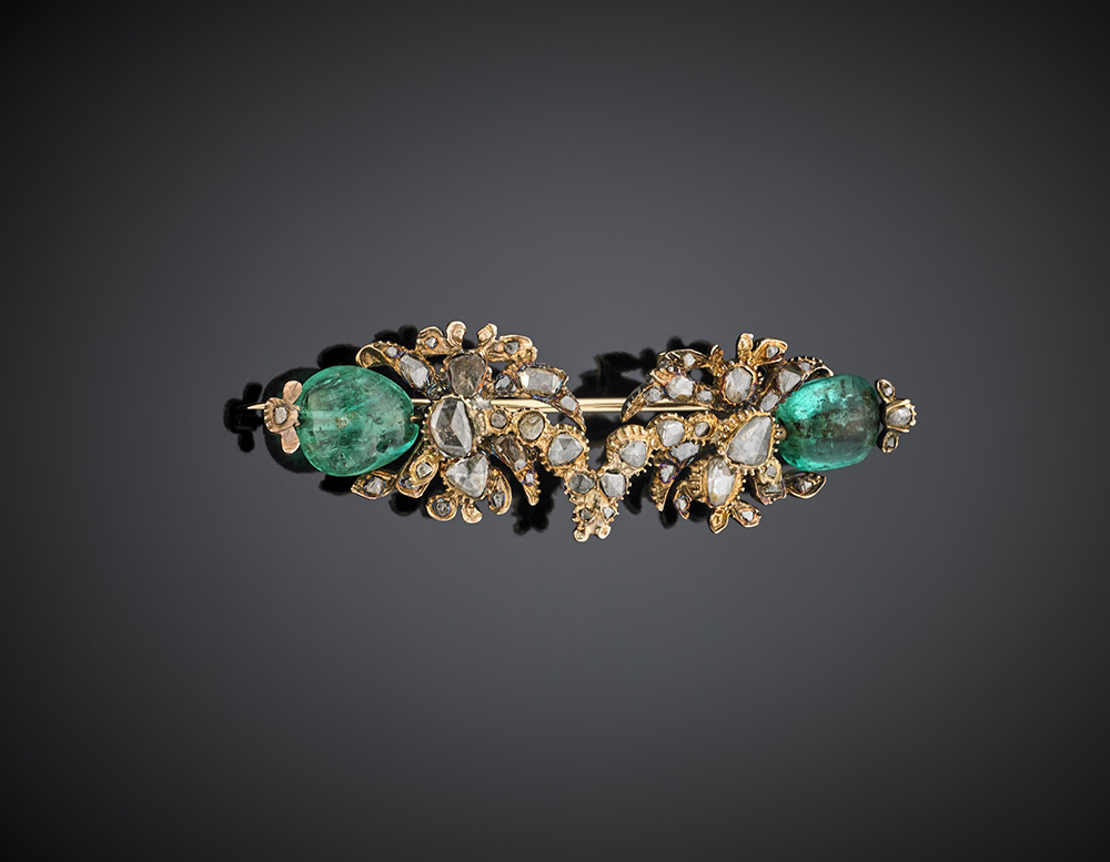 Broche in oro giallo 585/1000 con diamanti mezza rosetta irregolari e due boules di smeraldo, g. 13,90 g 13,91, lungh. cm 6,20 circa.