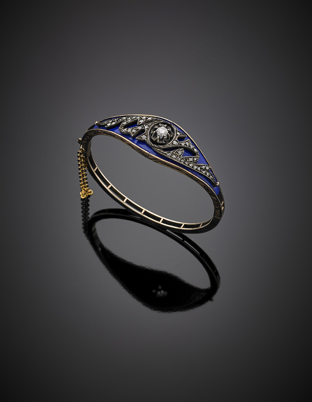 Bracciale rigido apribile in oro rosso 333/1000 e argento, rifinito in smalti e diamanti, con catenina di sicurezza in oro giallo, g 24,74, lungh. cm 5,70 circa.