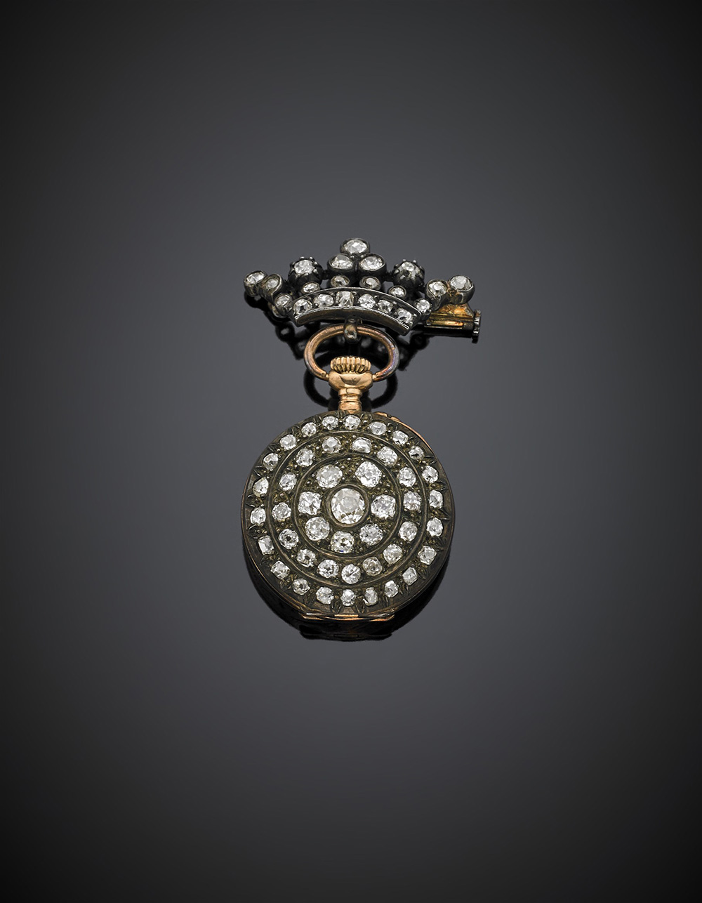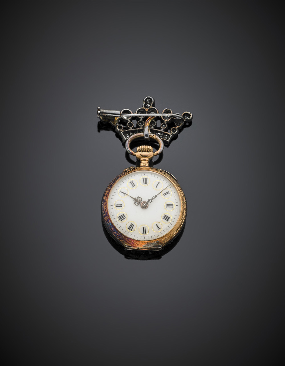 Broche in oro giallo e argento a guisa di corona con orologio pendente tutto rifinito in diamanti, g 15,63, lungh. cm 4,60 circa.