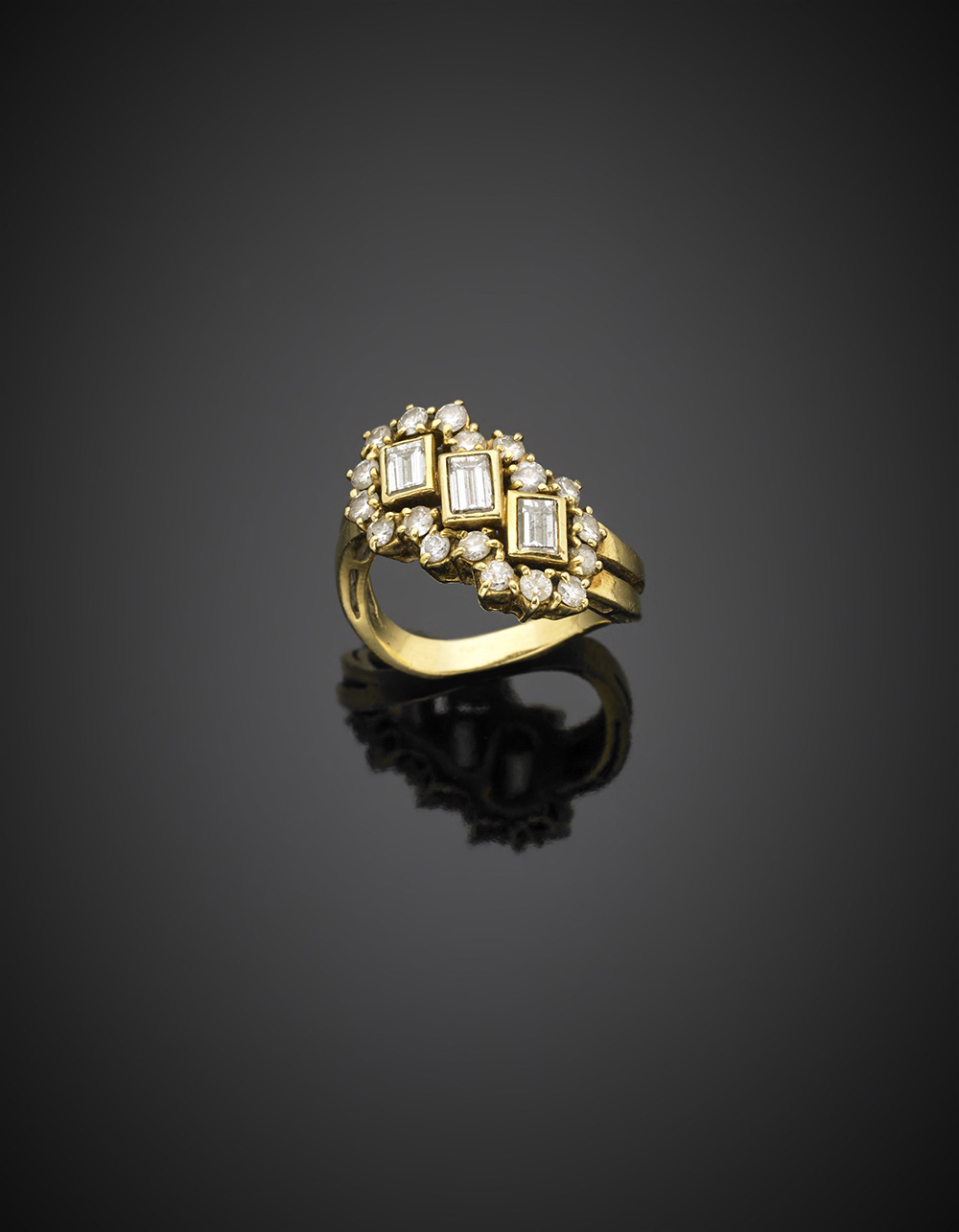 Anello in oro giallo con diamanti rotondi ed al centro tre a baguette, g 8,10 misura 13/53.