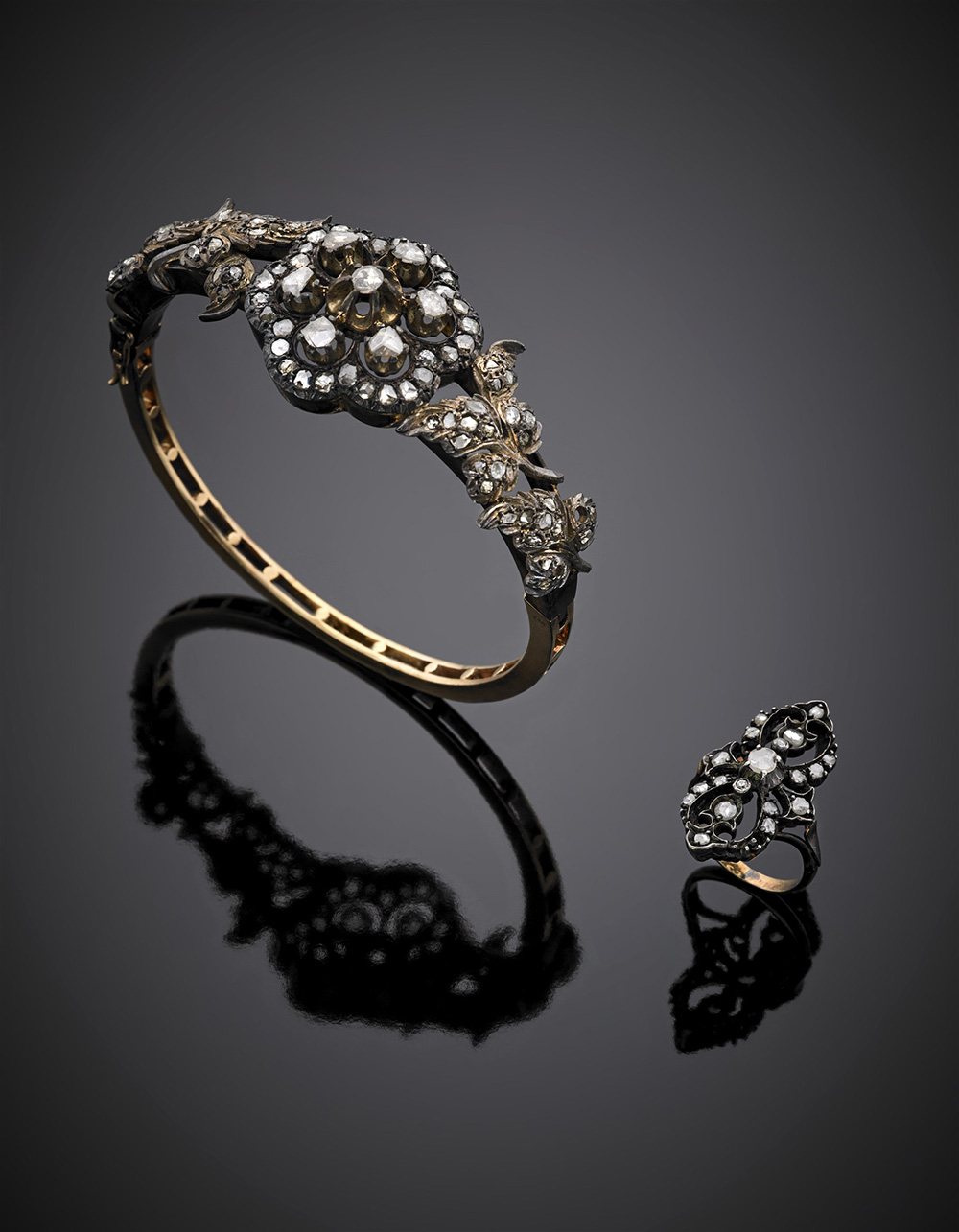 Demi-Parure composta da bracciale rigido apribile e anello in oro giallo e argento, diamanti irregolari flat e a mezza rosetta, complessivi g 46,18 misura 10/50. (difetti e mancanze)