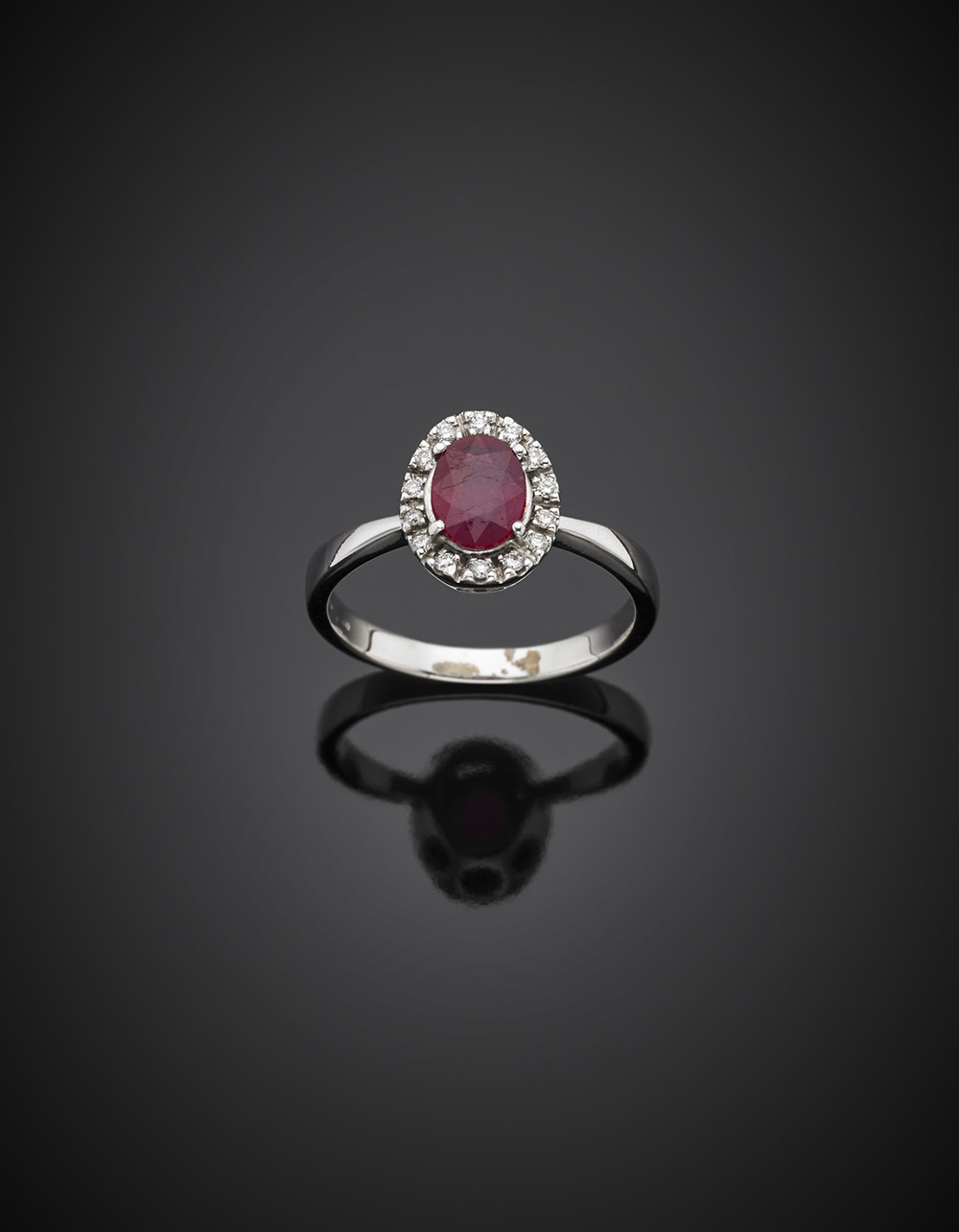 Lotto 920 | Anello in oro bianco con rubino ovale e diamanti intorno, g 5,18 misura...