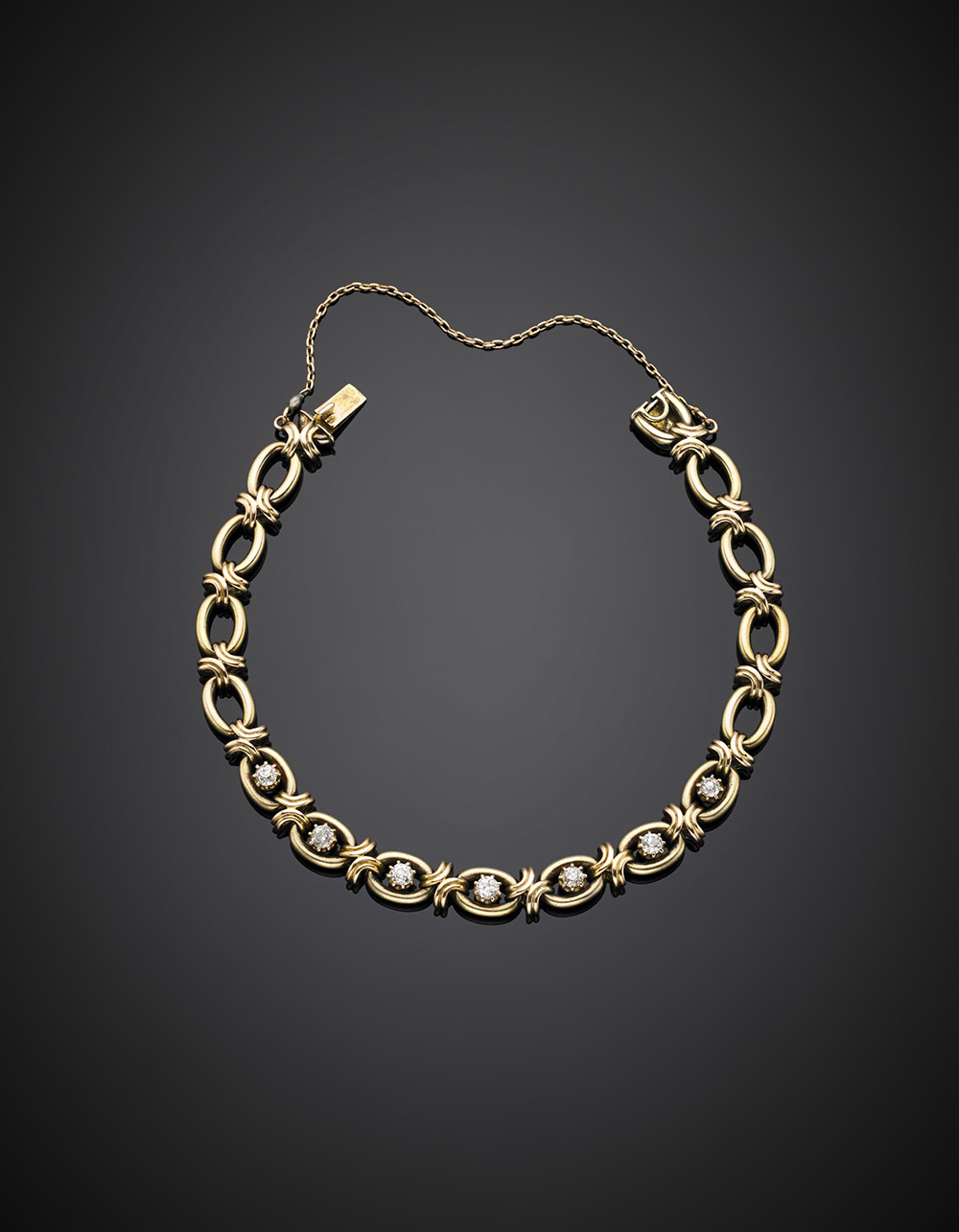 Bracciale a catena in oro giallo 582/1000 con sette diamantini, g 14,02. Marcato CB.