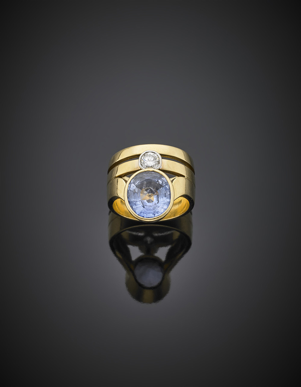 Oval ct. 6 circa sapphire and round ct. 0.40 circa diamond yellow gold band ring, g 18.37 size 17/57.