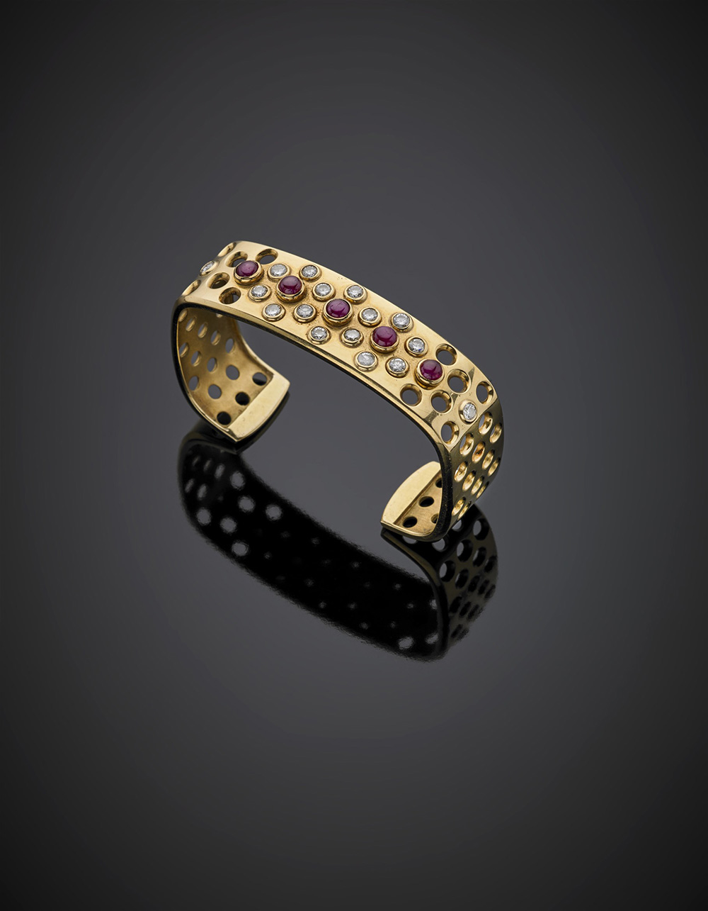 Yellow gold drilled cuff bracelet accented on the front with diamonds and cabochon rubies, g 33.14, diam. cm 5.20.