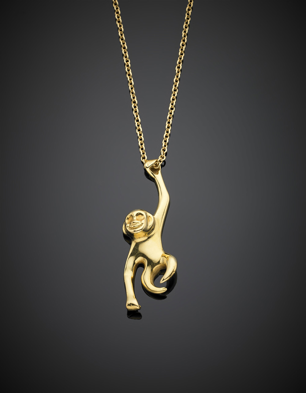 Pendente a guisa di scimmietta in oro giallo come la lunga catena rolò di cm 67,80, g 32,99, lungh. cm 5,50 circa.