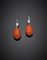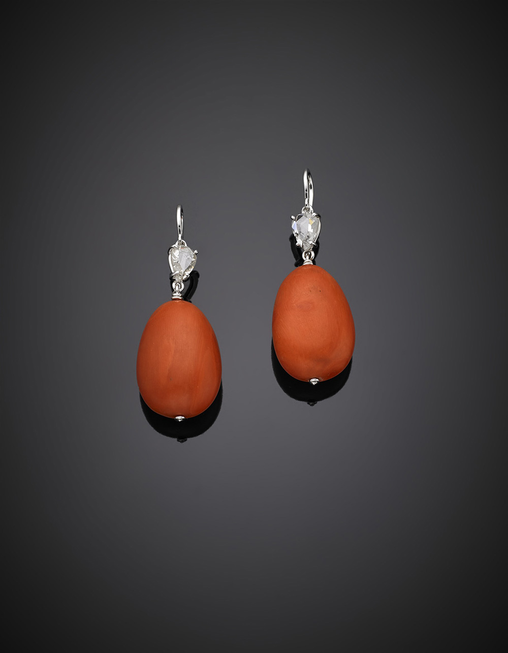 White gold rose cut diamond pendant earrings suspending two red/orange coral drops of mm 23,20x16x13 circa, g 16.50.