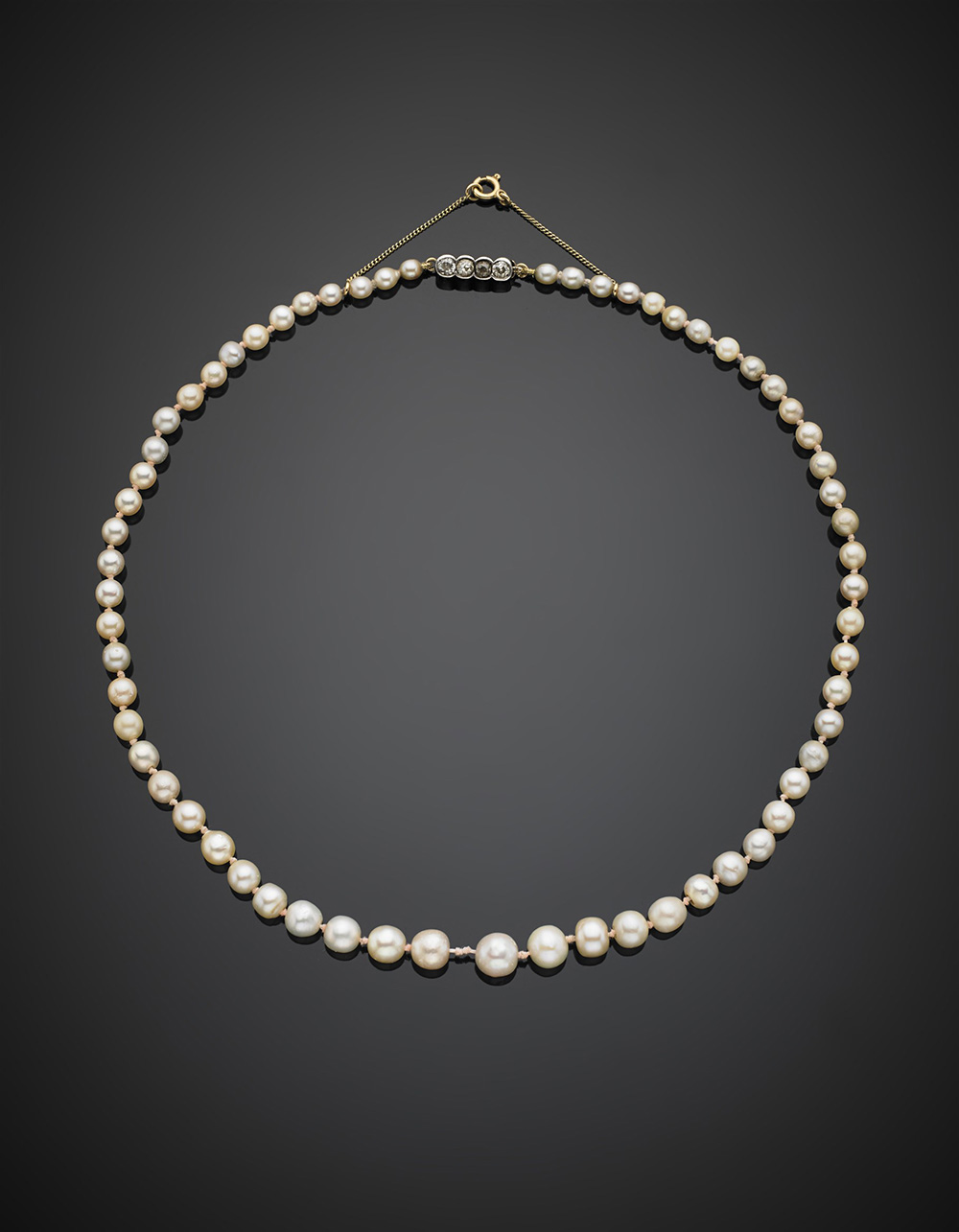 Collana a scalare di perle naturali e coltivate da mm 4,04 a mm 8,03, chiusura in oro giallo, argento e diamanti, g 17,27, lungh. cm 45,50 circa.