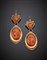 Orecchini pendenti in oro rosso 333/1000 con coralli scolpiti, dei quali i due ovali a guisa di viso di donna, g 26, lungh. cm 9 circa.