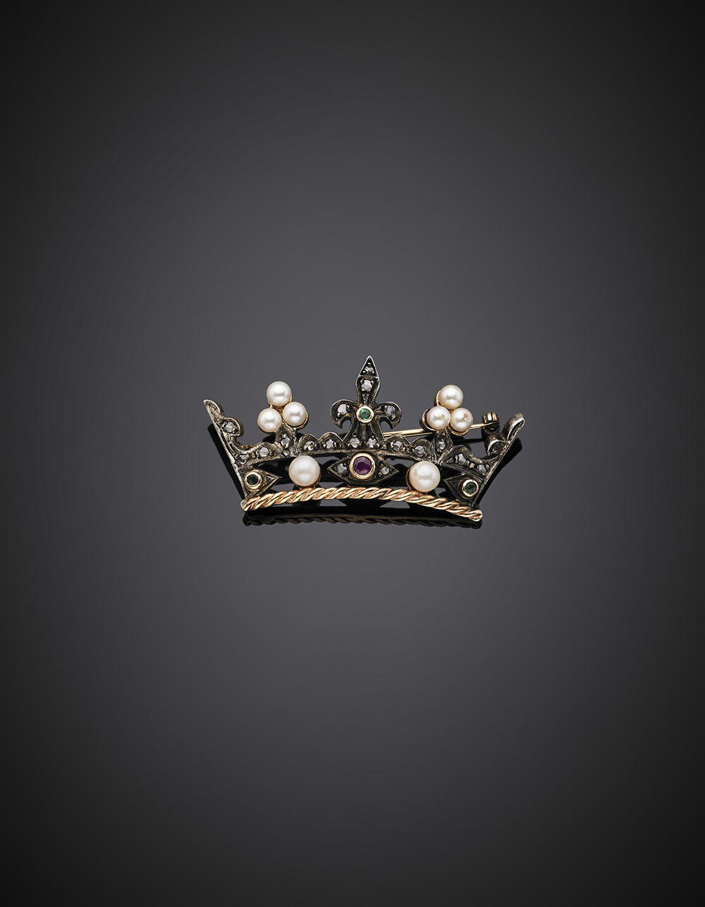 Spilla a corona marchionale in oro giallo 585/1000, argento, perle , diamanti irregolari e gemme varie, g 8,83, lungh. cm 5 circa.