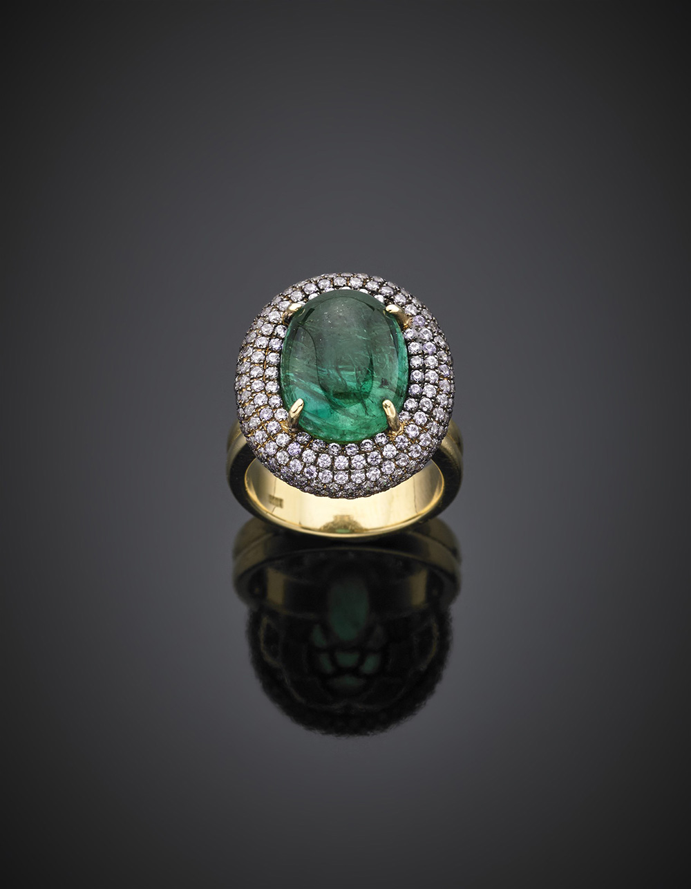 Lotto 977 | Anello in oro giallo con smeraldo ovale cabochon di ct. 9,96 circa contornato...