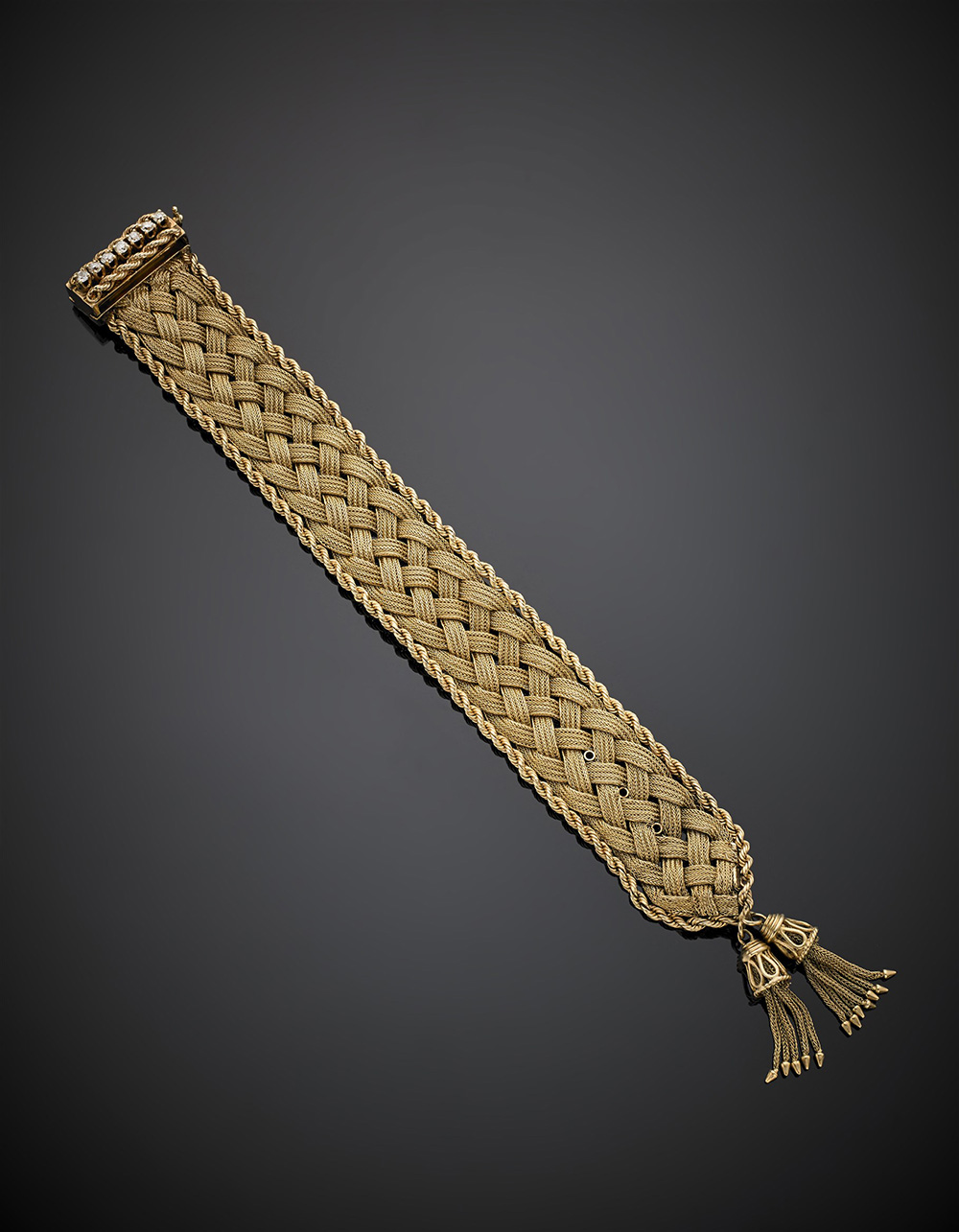 Yellow 14K gold woven adjustable bracelet with diamond buckle and terminated by two tassels, g 68.05, length cm 21.20, h cm 2.60 circa. In original case (losses)