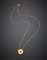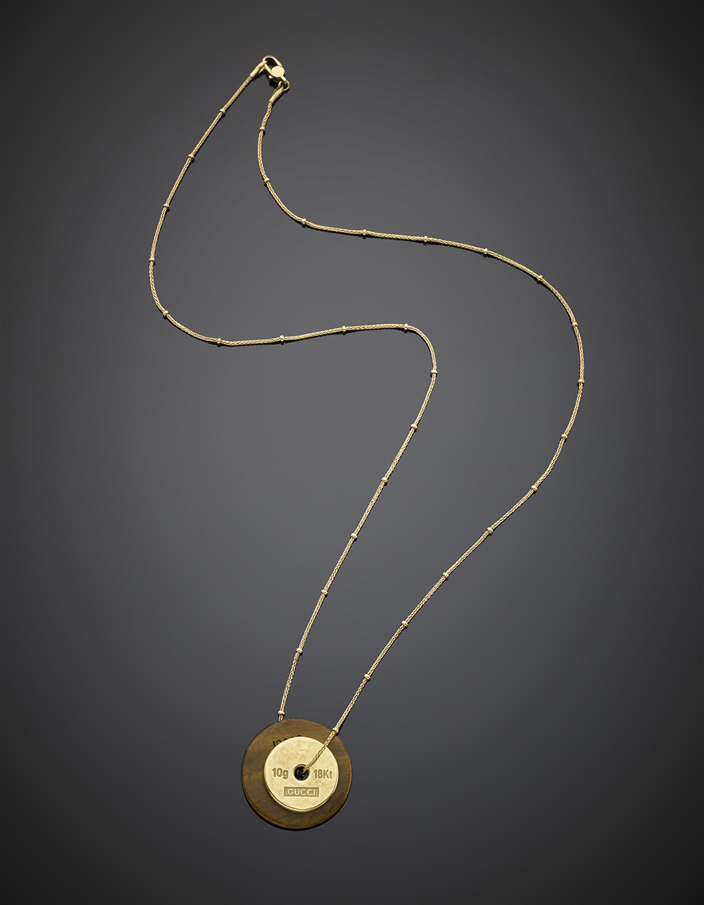 Catenina con pendente a disco in oro giallo e occhio di tigre, g 21,33, lungh. cm 62, diam. cm 3 circa. Firmato GUCCI.