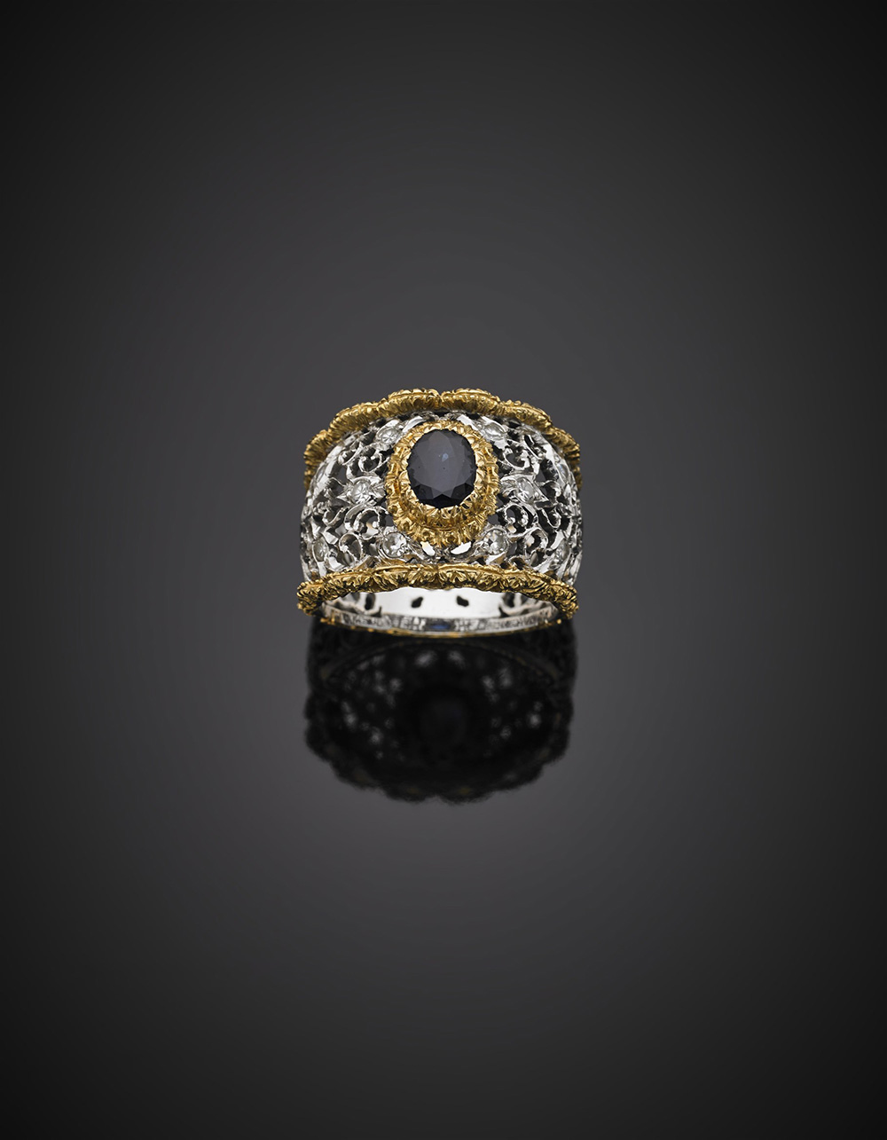 Ovalo sapphire and diamond, bi-coloured gold openwork band ring, after Buccellati, g 7.27 size 13/53.