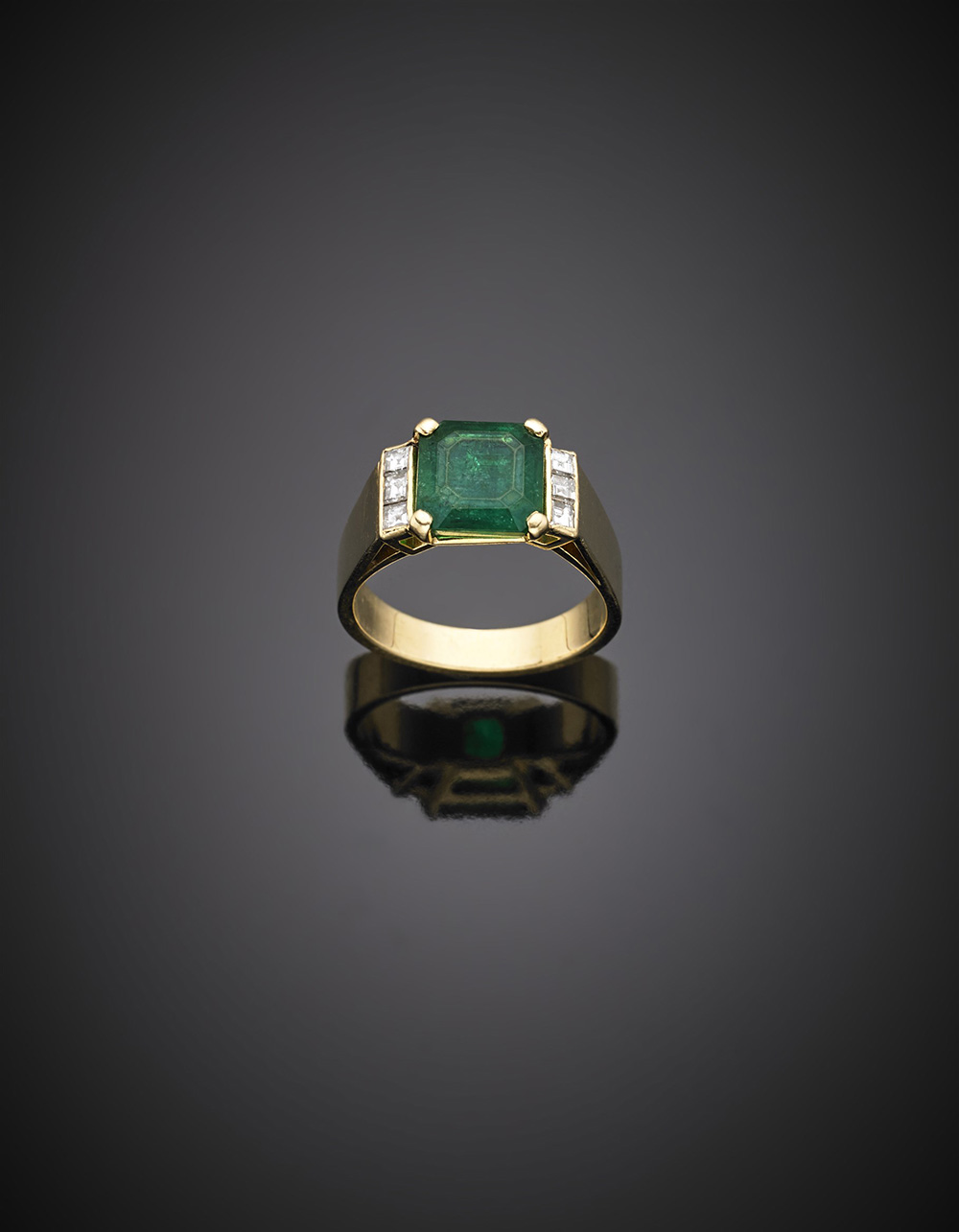 Anello in oro giallo con diamanti carrè ai lati di uno smeraldo ottagonale, g...