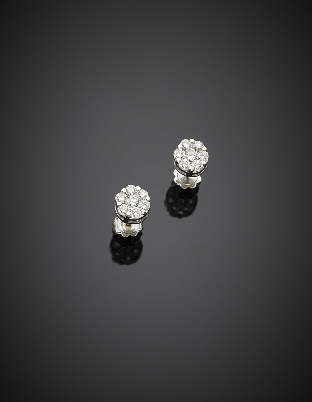 Orecchini a lobo in oro bianco con diamanti rotondi taglio brillante moderno europeo per complessivi ct. 1,40 circa, g 3,60.