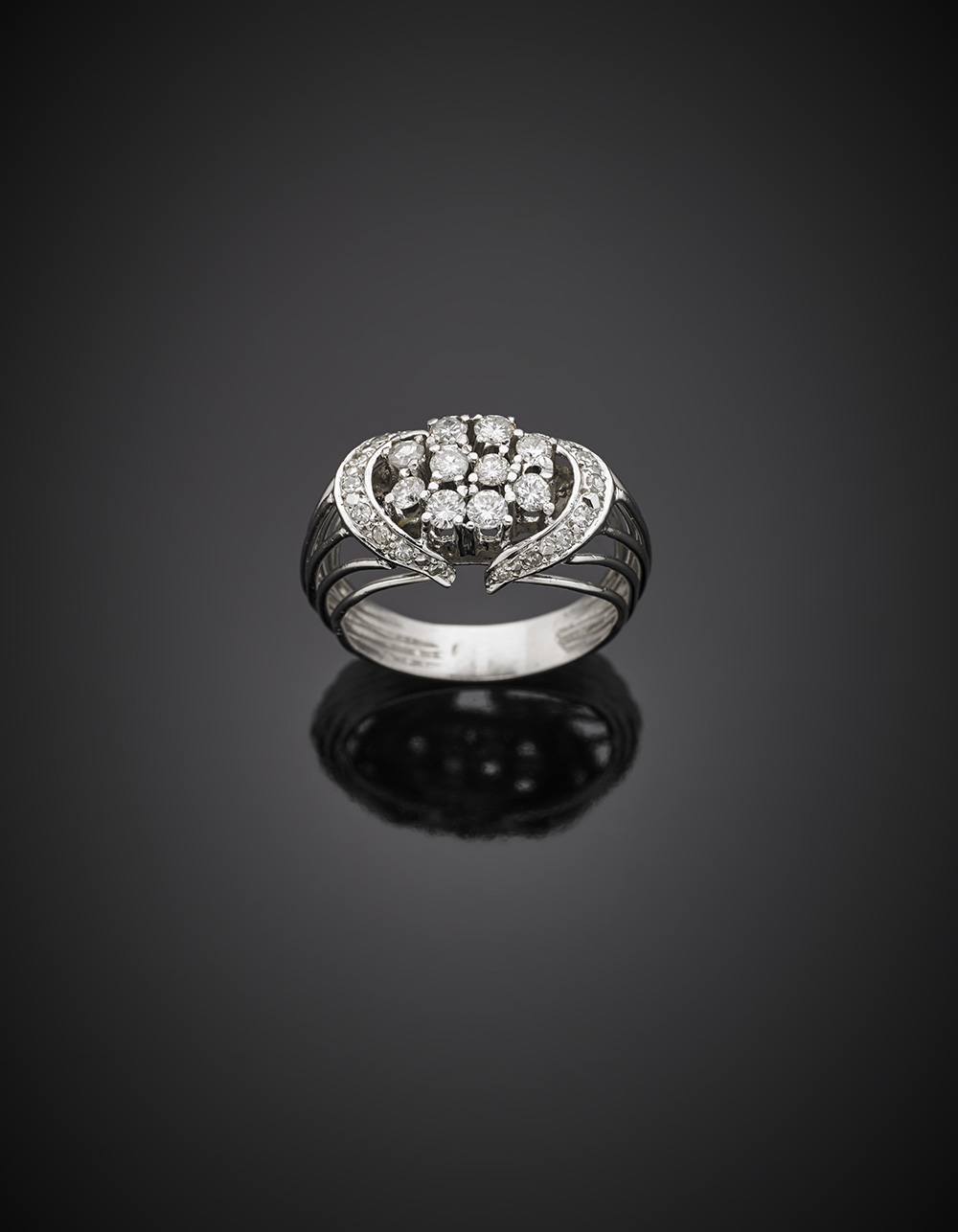 Anello in platino con gambo a fili e diamanti, g 6,78 misura 15/55.