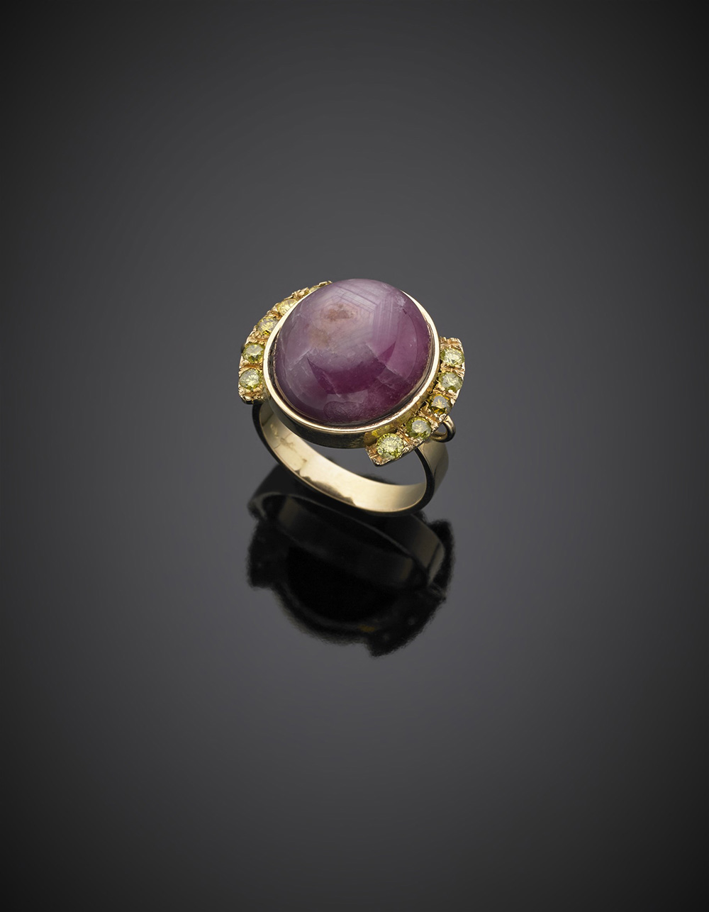 Anello in oro giallo con rubino stellato cabochon di ct. 17 circa, affiancato da diamanti fancy, g.9.68 misura 12/52 g 9,70 misura 12/52.
