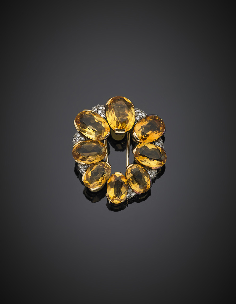 Lotto 1002 | Broche in oro giallo e argento con otto quarzi citrini ovali distanziati tra...