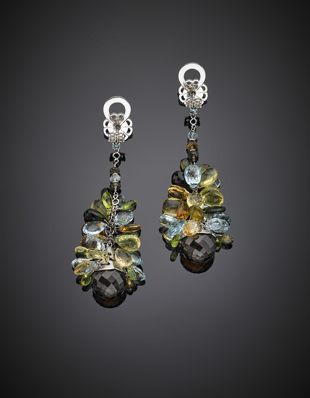 White gold pendant earrings with different briolette gems hanging in a bunch, g 41.09, length cm 7.20 circa.