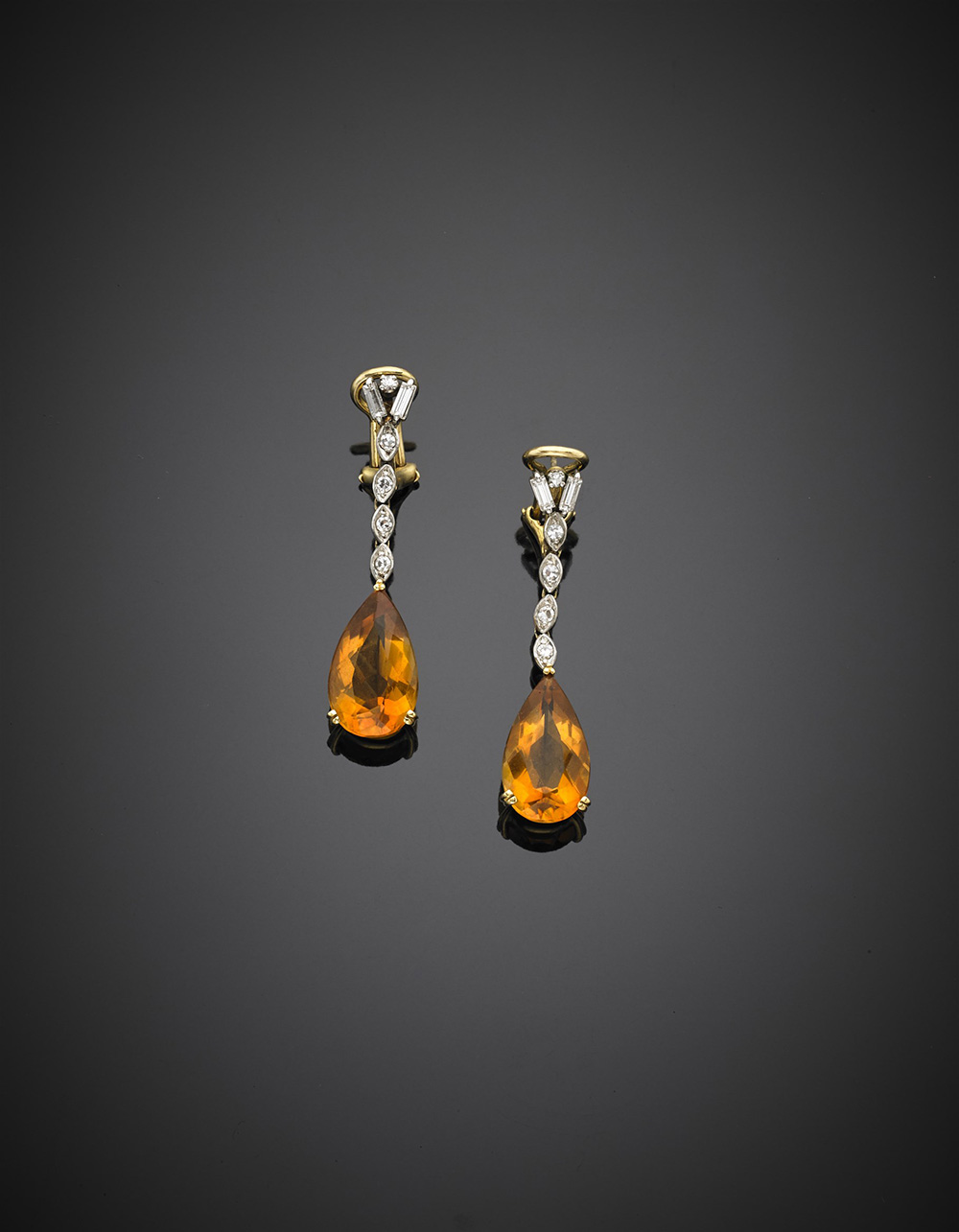 Orecchini pendenti in oro giallo e bianco, quarzi citrini a goccia, diamanti rotondi e baguette a rifinirli, g 9,50, lungh. cm 4,30 circa.