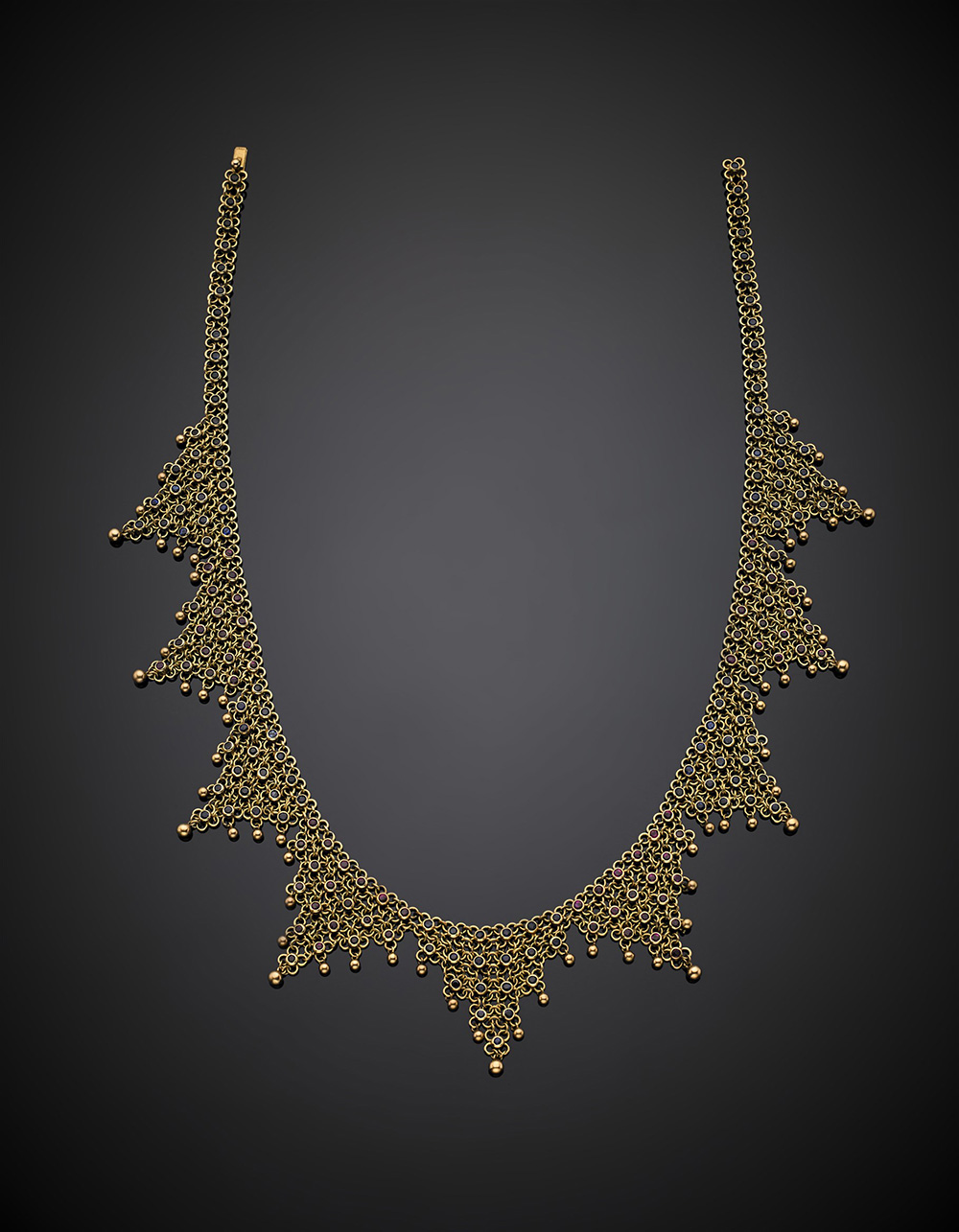 Yellow gold mesh fringe necklace, accented with rubies and sapphires, g 55.60, length cm 43, h cm 3 circa.