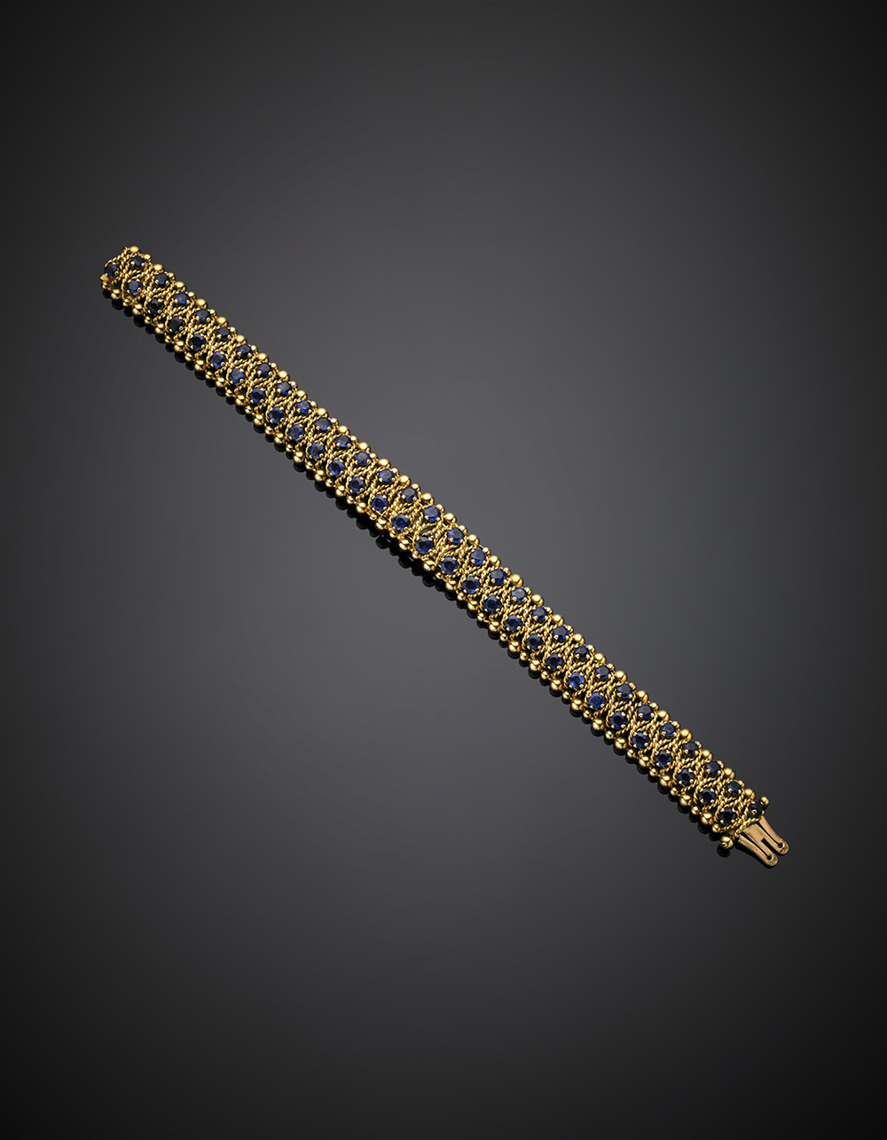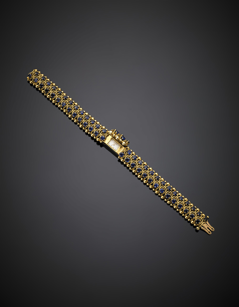 Yellow gold sapphire bracelet with hidden watch, n° 5214, g 60.40, length cm 18.30 circa.