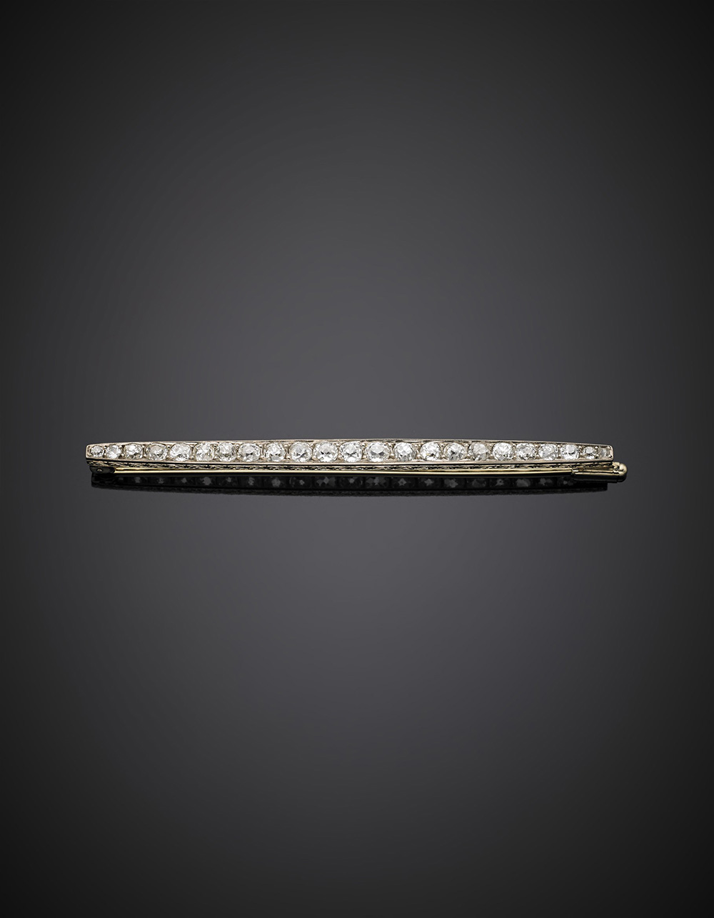 Spilla a barretta in oro bianco con diamanti a cuscino, g 7,69, lungh. cm 8 circa.