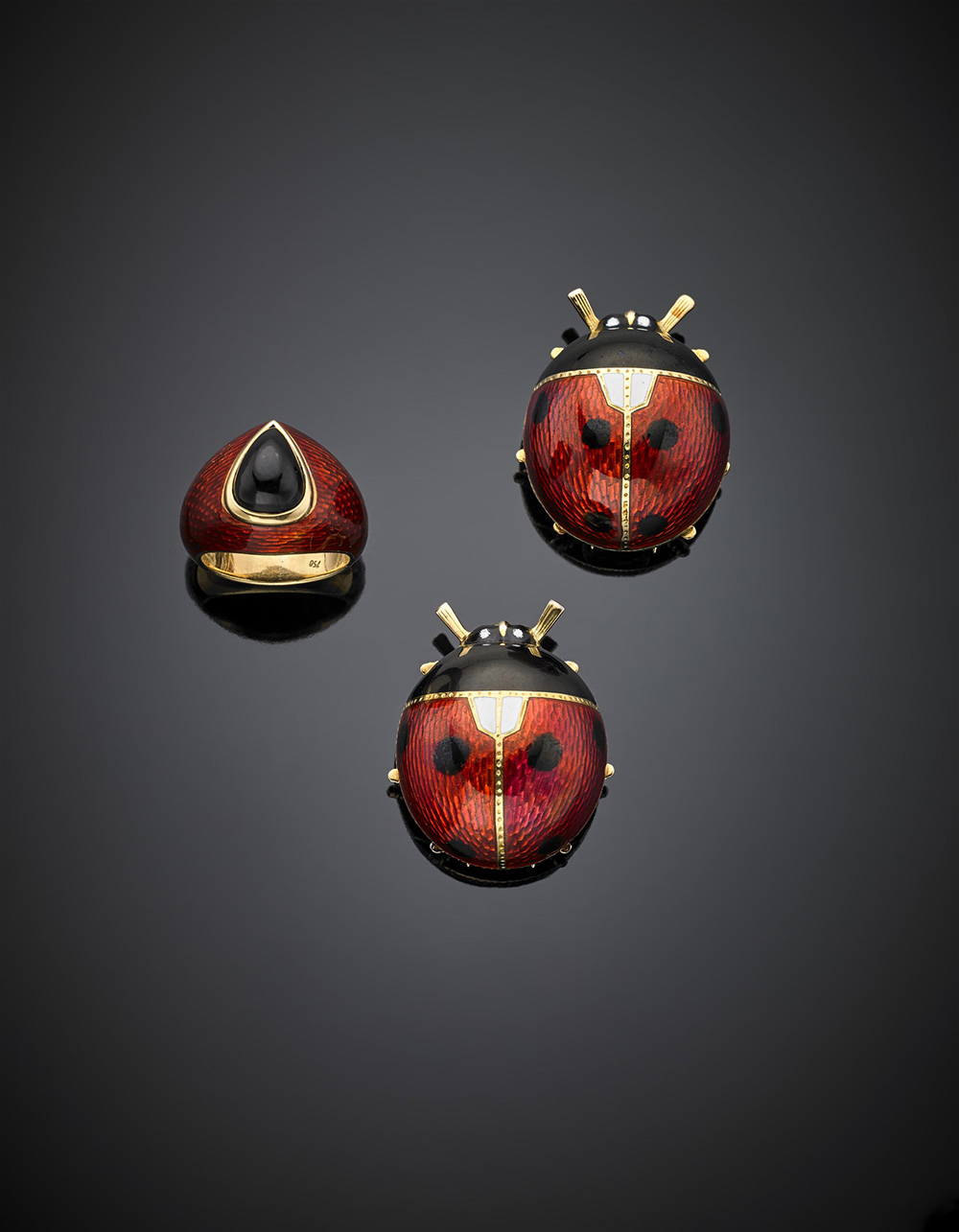 Demi-parure composta da anello e due broches a guisa di coccinella tutto in oro giallo con smalti e onice a goccia, complessivi g 45,71 misura 6/46.