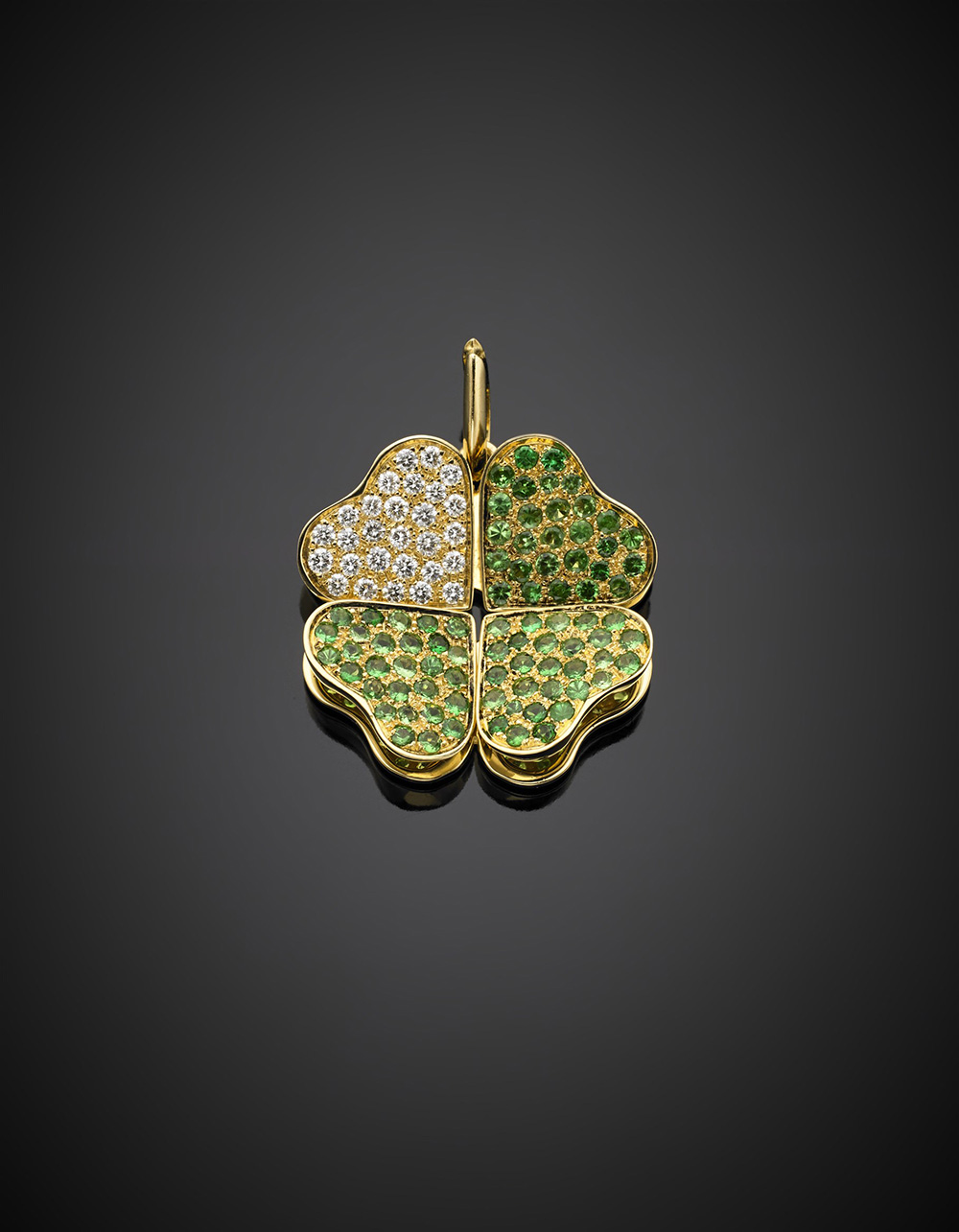 Pendente a guisa quadrifoglio con foglie mobili in oro giallo con smeraldi e diamanti, g 18,84, lungh. cm 4 circa.