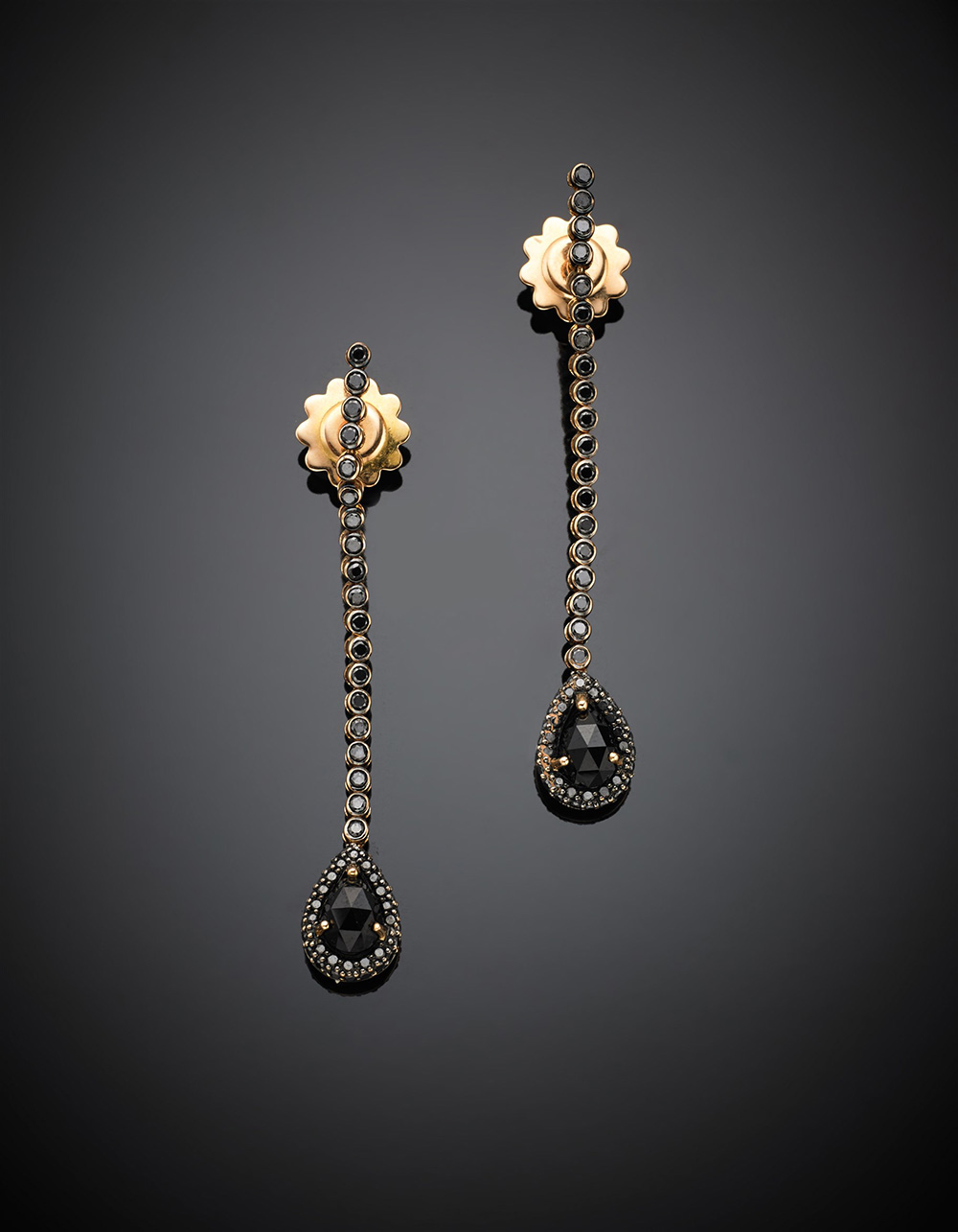 Orecchini pendenti in oro rosso con diamanti neri rotondi e terminati da due gocce mezzo briolè, g 7, lungh. cm 5,50 circa.