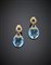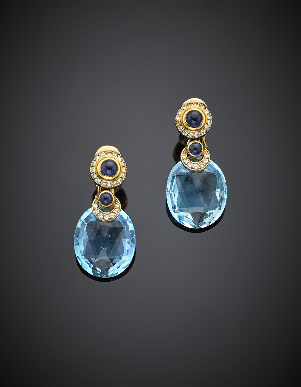 Oval blue topaz, cabochon sapphire and diamond yellow gold pendant earrings, g 18.31, length cm 3.50 circa. Signed FARAONE. In original pouch