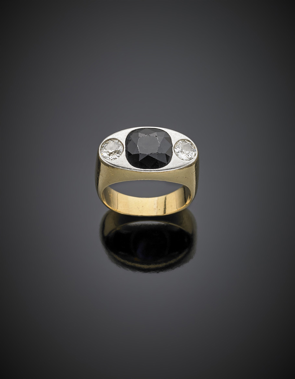 Anello in oro bianco e giallo con due diamanti rotondi per complessivi ct. 0,70 circa ai lati di uno zaffiro a cuscino di ct. 3,75 circa, g 13,45 misura 17/57. In scatola originale di Falliva Panizzi, Milano