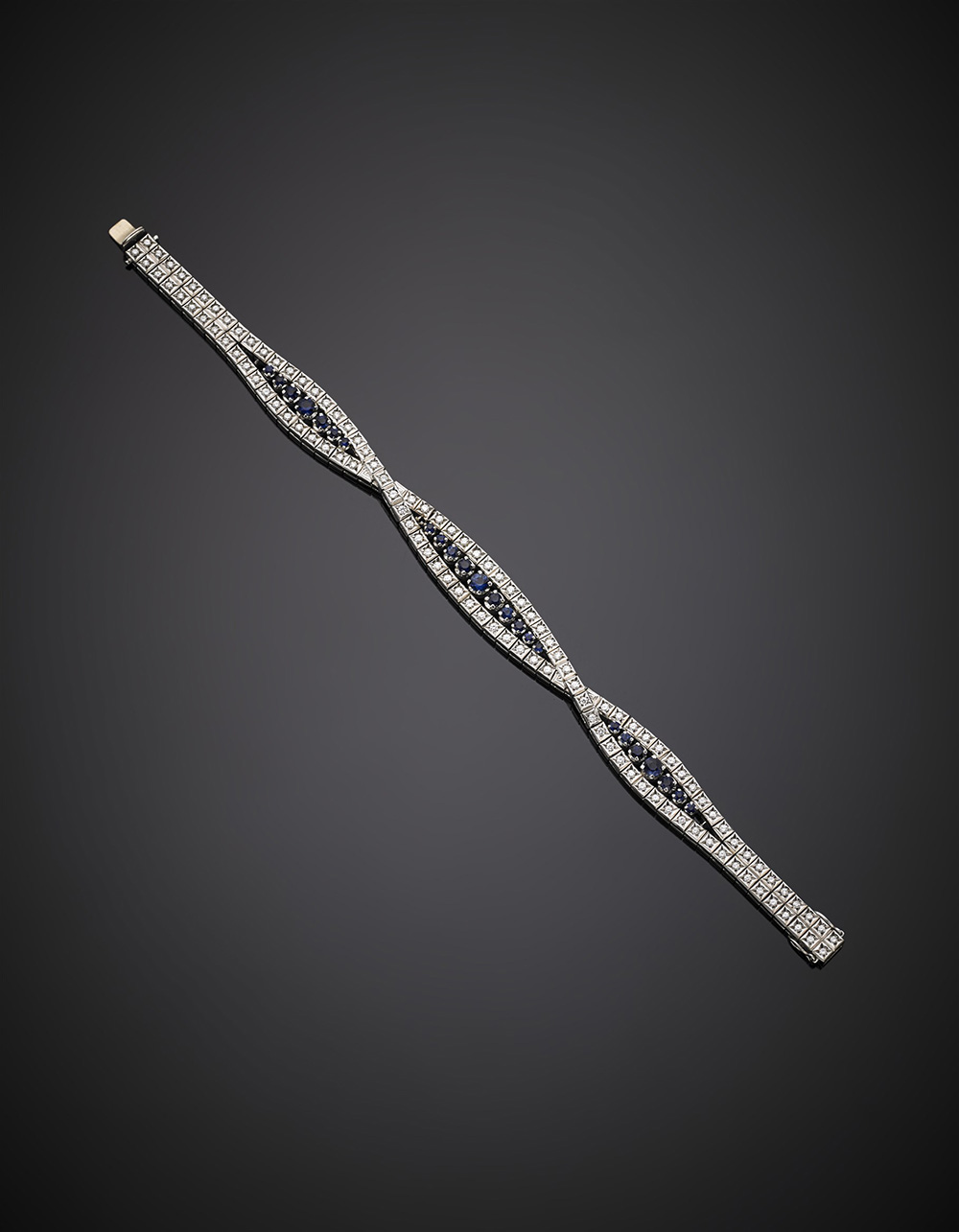 Bracciale con intreccio in oro bianco, diamanti e zaffiri, g 32,82, lungh. cm 18,50 circa.