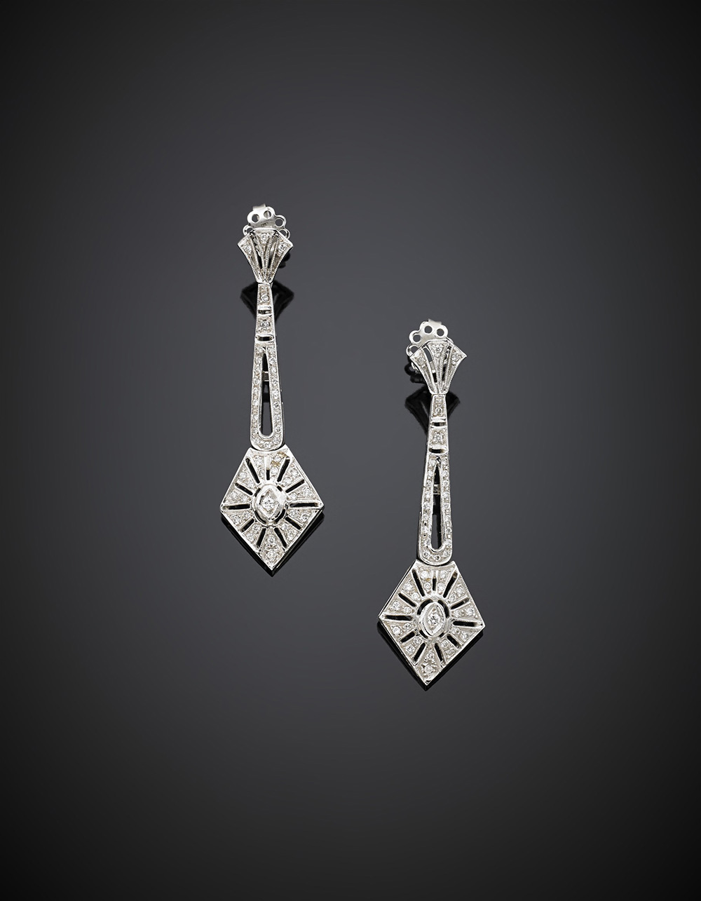 Orecchini pendenti in oro bianco con diamanti, g 8,90, lungh. cm 4,70 circa.