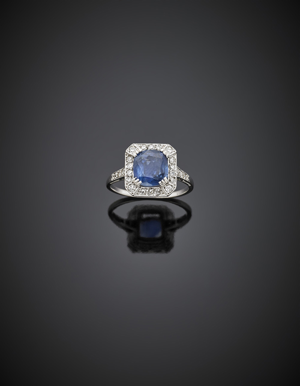Anello in oro bianco e diamanti con zaffiro a cuscino di ct. 2 circa, g 4,37...