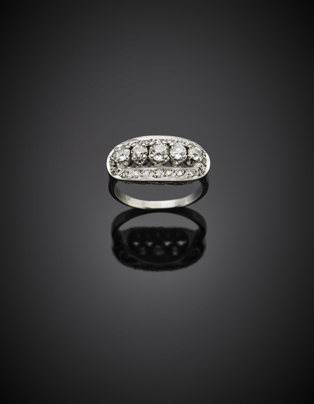 Anello in platino, con cinque diamanti rotondi ed altri di contorno, g 5,03...